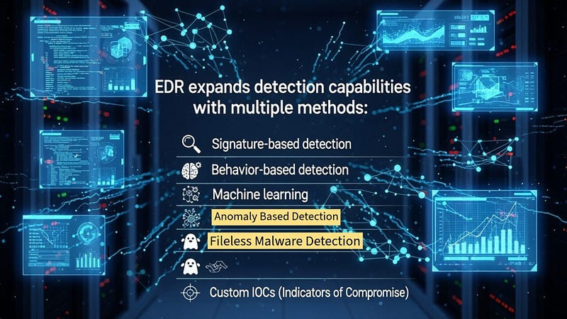 While AV primarily focuses on blocking known malware using signature-based detection, EDR takes a much more active and comprehensive approach. It is designed to monitor, detect, and respond to suspicious activities in real-time, even if the threat is new or has been customized to evade traditional defenses. EDR achieves this by employing a variety of advanced detection methods, including behavioral analysis, machine learning, anomaly detection, and the ability to spot fileless malware.